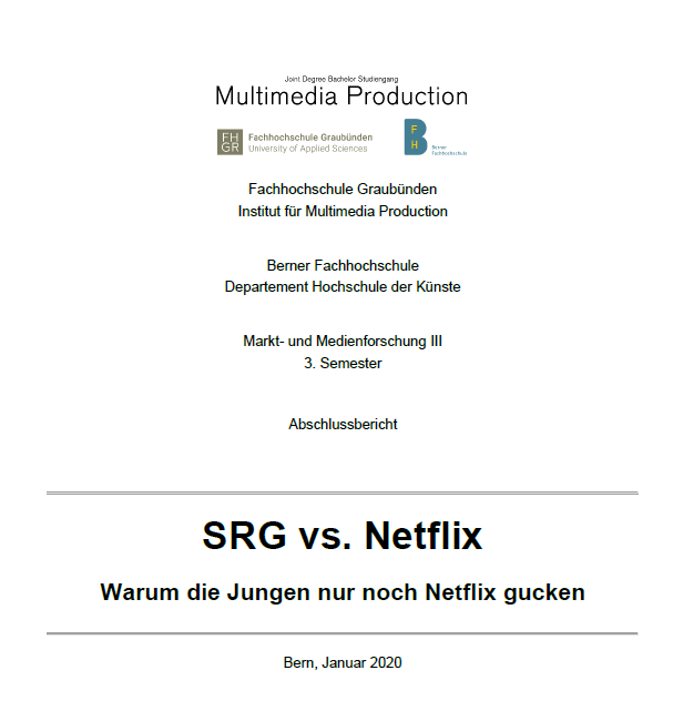 Im dritten Semester in Markt- und Medienforschung behandelten wir die Methode der Gruppendiskussion. Der Abschlussbericht zum Thema «SRG vs. Netflix: Warum die Jungen nur noch Netflix gucken» könnt ihr hier sehen.